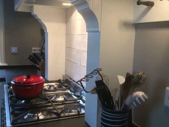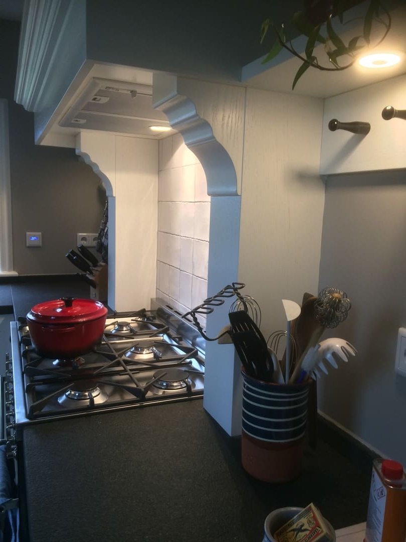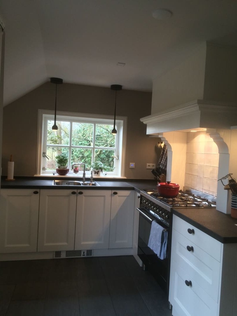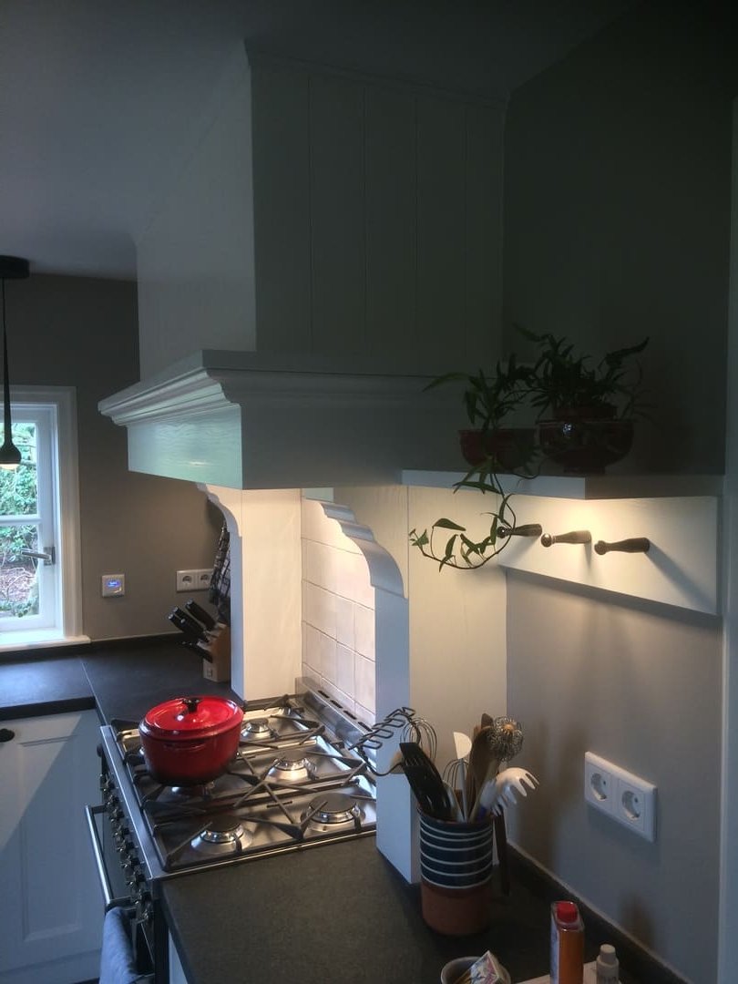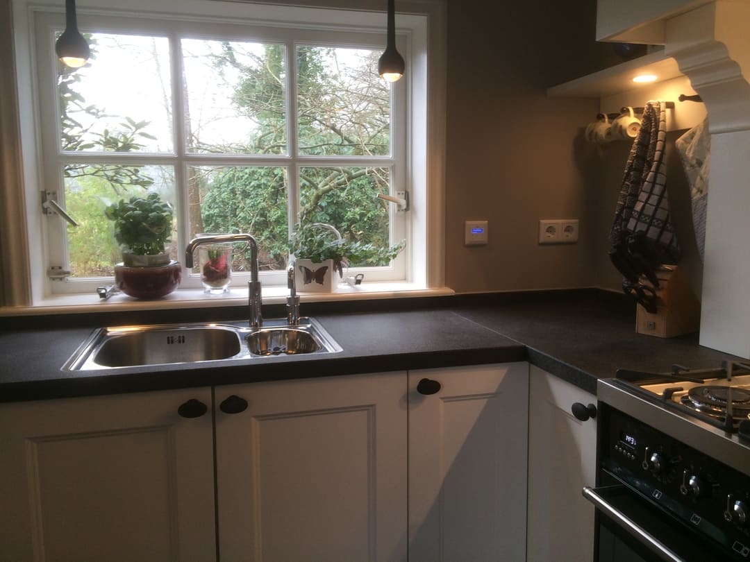 Familie Versluis had de specifieke wens om niets te hoeven ondernemen voor de nieuwe keuken. Om ze geheel te ontzorgen hebben we alle benodigde werkzaamheden voor hen verricht: Demontage, leidingwerk, stucwerk, tegelwerk, montage en het benodigde schilderwerk. Ook de in stijl van de keuken gemaakte lambrisering in de naastgelegen eetkamer is in onze eigen werkplaats gemaakt.